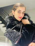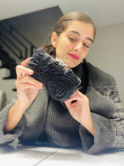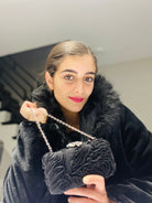 stunning black satin ribbon design evening bag rhinestone closure and silver chain