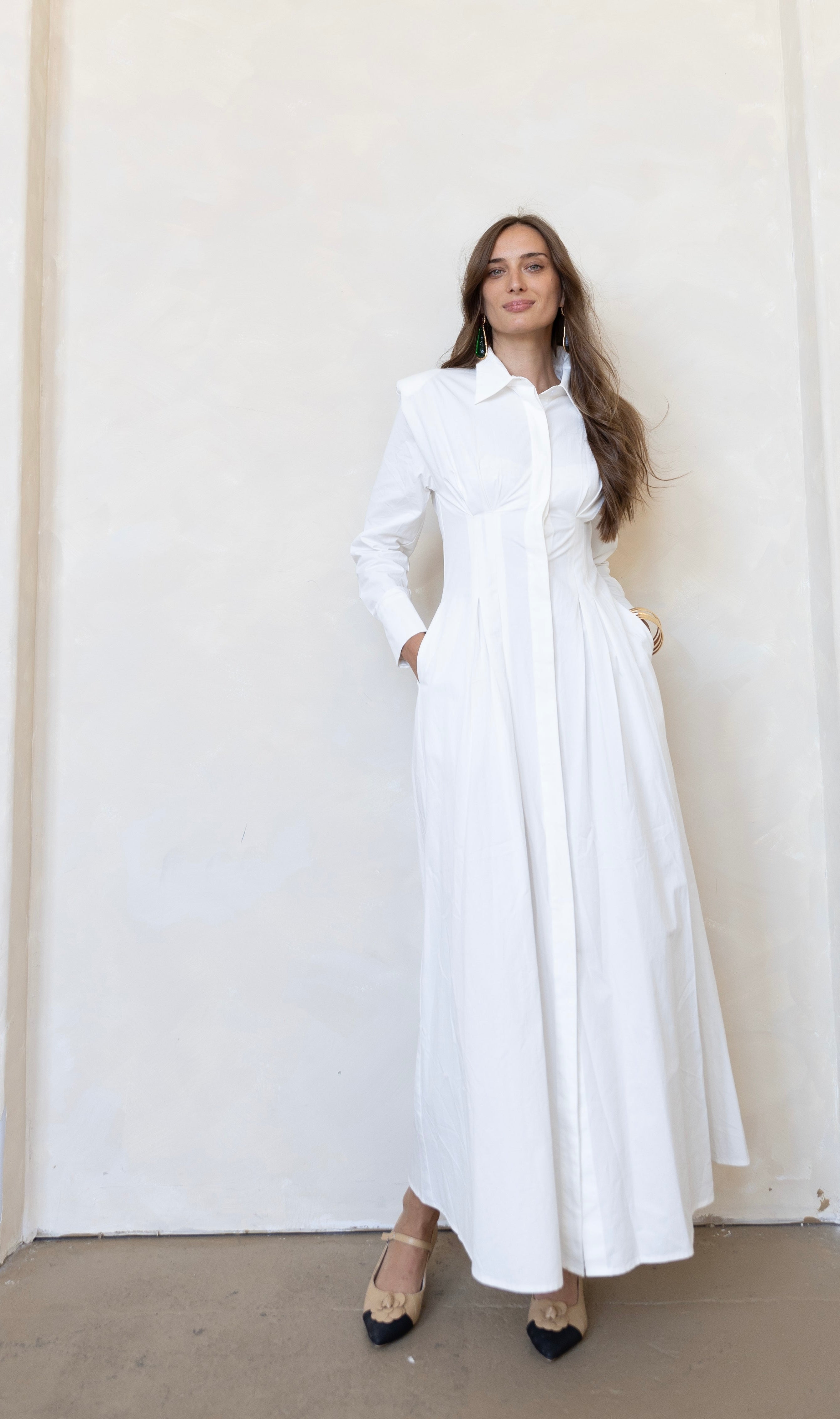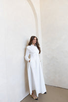 This Byrd Marianna Dress is a stylish and versatile addition to any wardrobe. With its crisp white color and long sleeves, this dress is perfect for any occasion. The hidden buttons in the front provide a sleek and polished look, making it a must-have for those looking to make a statement.Discounted products are not returnable or exchangeable