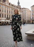 Featuring a classic black background adorned with vibrant and eye-catching multi-colored flowers, the Byrd Rebecca Dress is a versatile and stylish addition to any wardrobe. Complete with a matching belt, this dress is perfect for both casual and formal occasions.