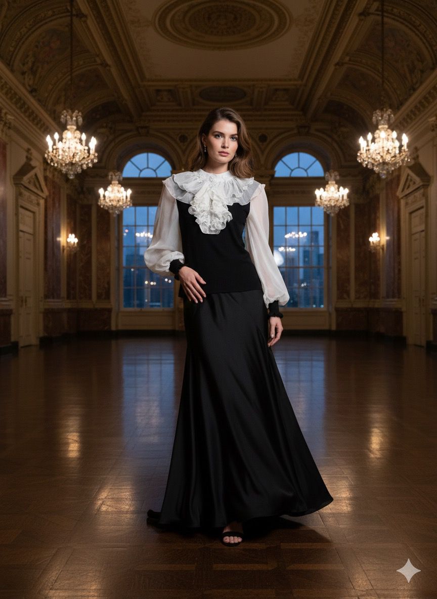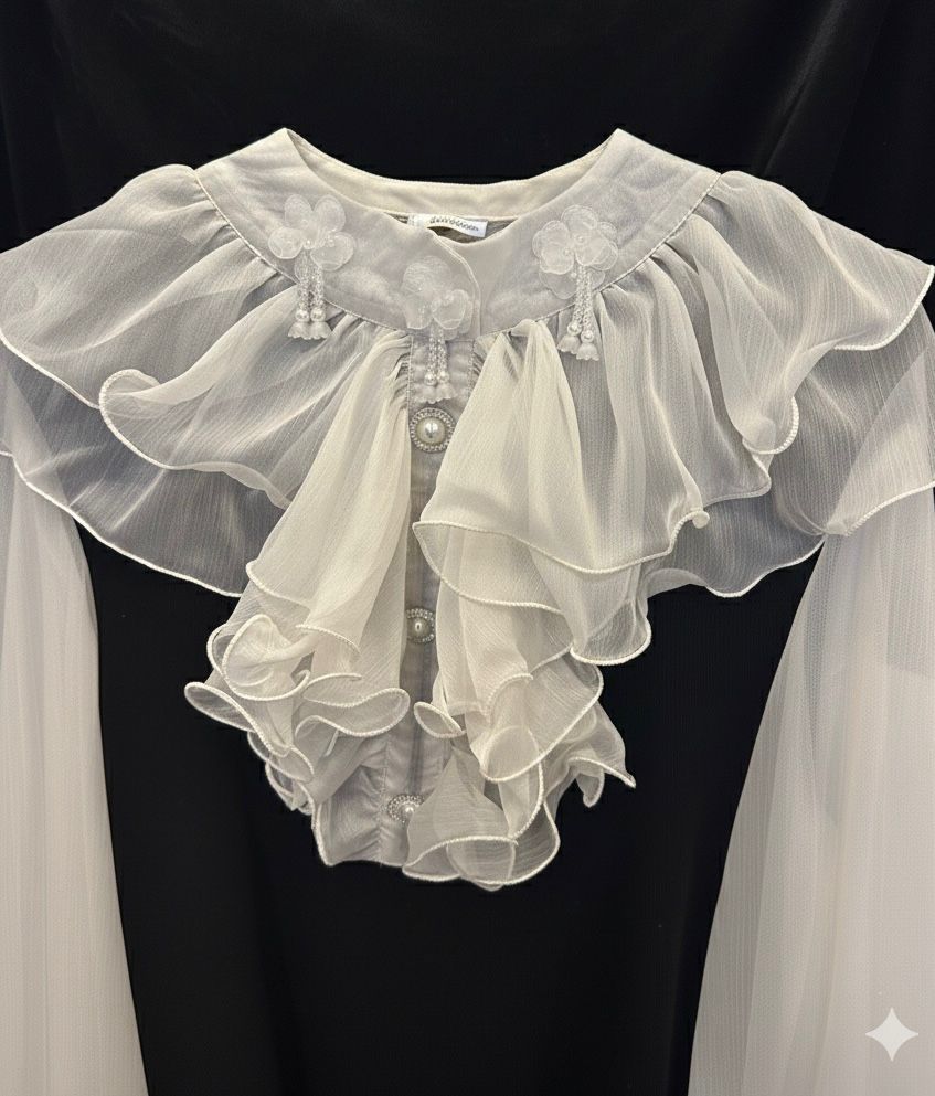 Expertly designed with a combination of soft chiffon cream sleeves and a black knit collar and cuffs, the Beulah Chiffon and Knit Combo Blouse exudes elegant style. Adorned with delicate flower pearls and accented with pearl and rhinestone buttons, this blouse is perfect for both professional and formal occasions. Its classic black knit front and back add a touch of sophistication to any outfit.Discounted products are not returnable or exchangeable
