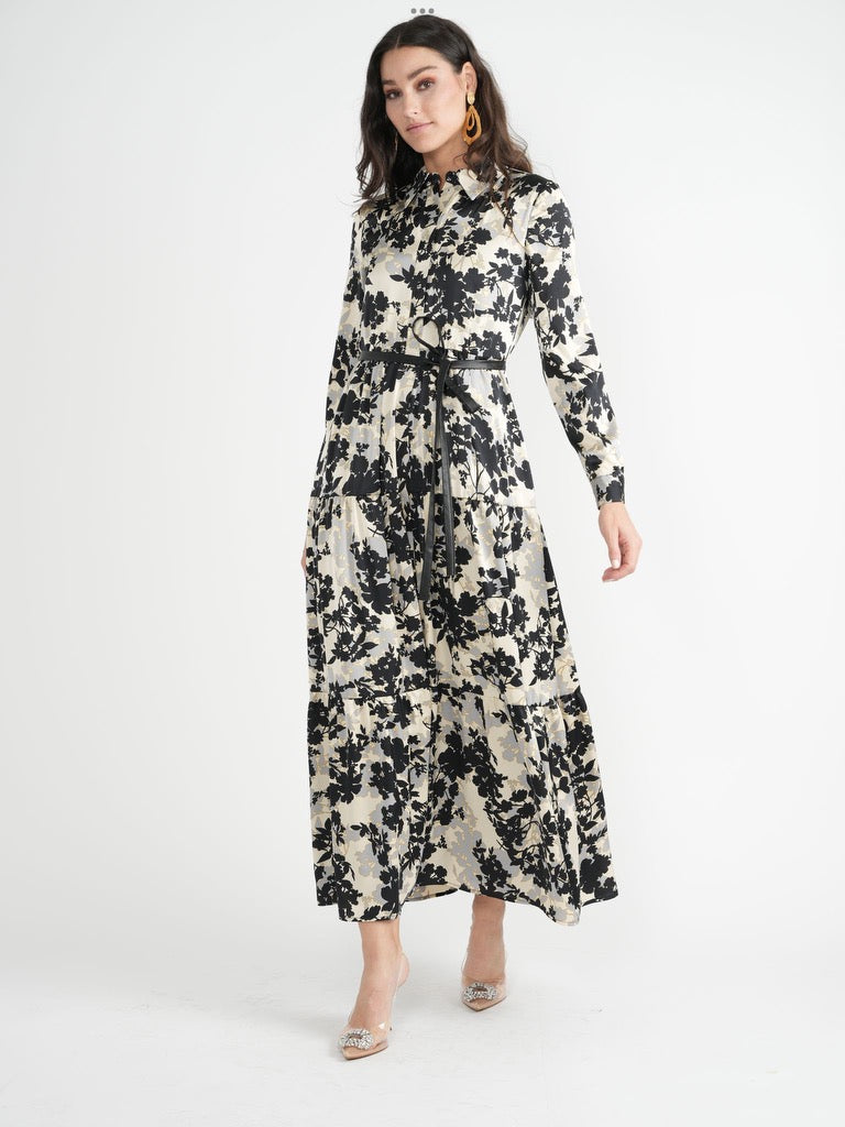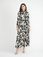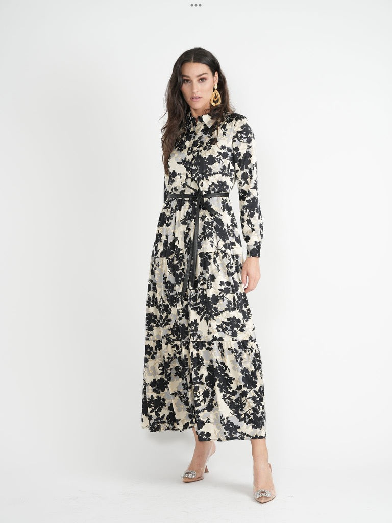 Crafted with a black, white, and grey floral print, the Caitlin Floral Print Dress with Belt is a versatile and stylish addition to any wardrobe. The included belt accentuates your waistline, while the classic print adds a touch of elegance. Perfect for day or night, this dress is a must-have for any fashion-forward individual.Self belted dress