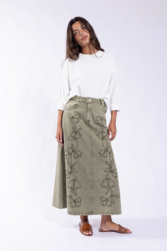 Olive green color Aline skirt with front zipper and side pocket . Doodle embroidered print infront. day. Discounted products are not returnable or exchangeable The Concept Embroidered Doodle Skirt features an olive-colored A-line design, complemented by a front zipper and a convenient side pocket. Its embroidered doodle print adds a unique visual element, making it suitable for various day-to-day activities. Note that discounted items are final sale and not eligible for return or exchange.