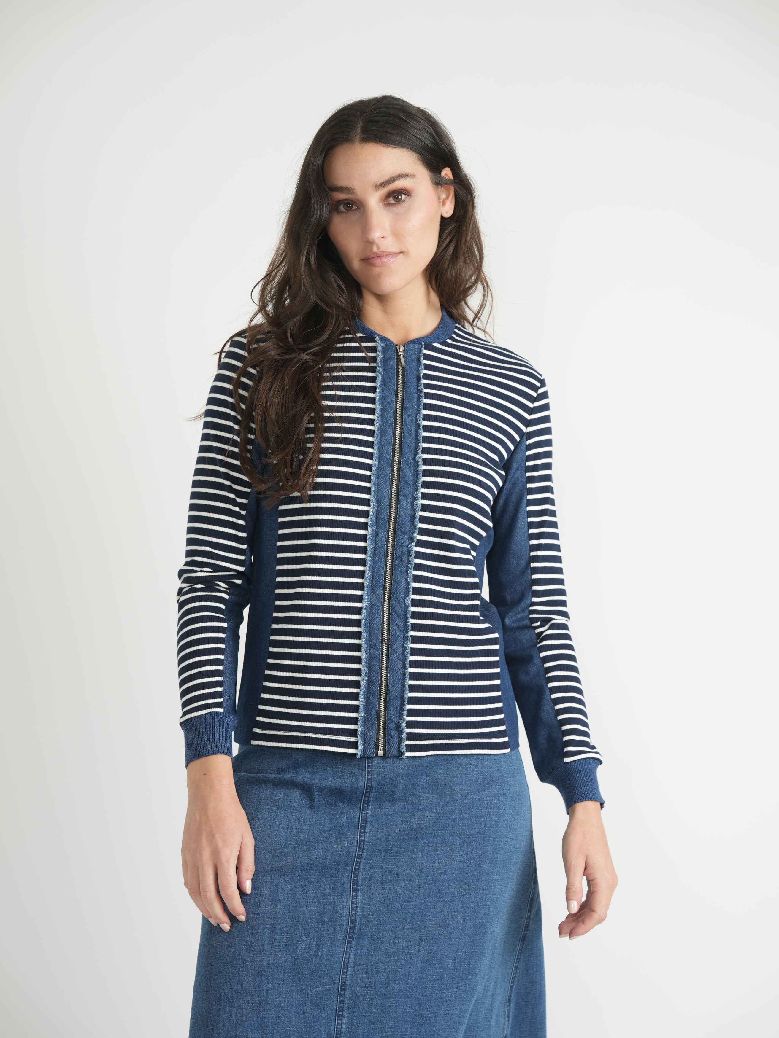 Introducing the Dot Denim Striped Trim Jacket. Made of denim and adorned with bold blue stripes, this jacket adds a touch of fun to any outfit. Its casual look is perfect for any occasion.