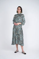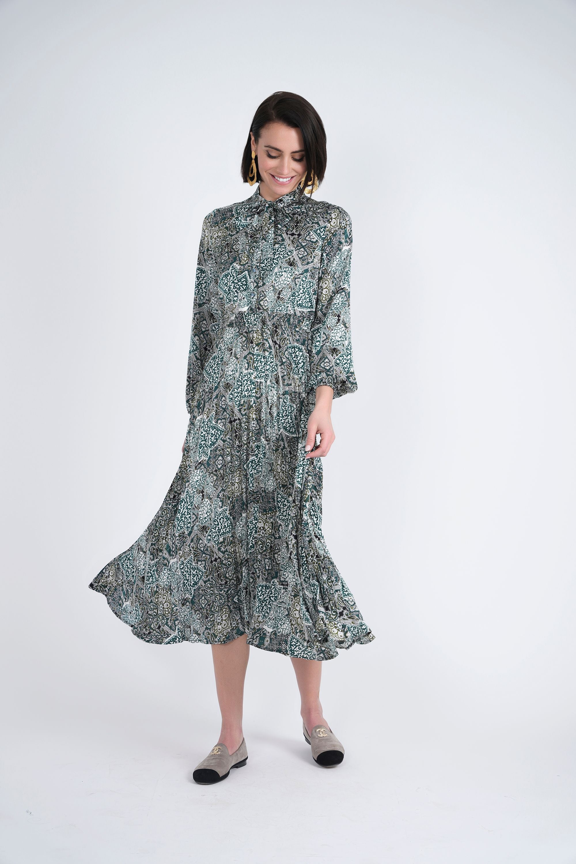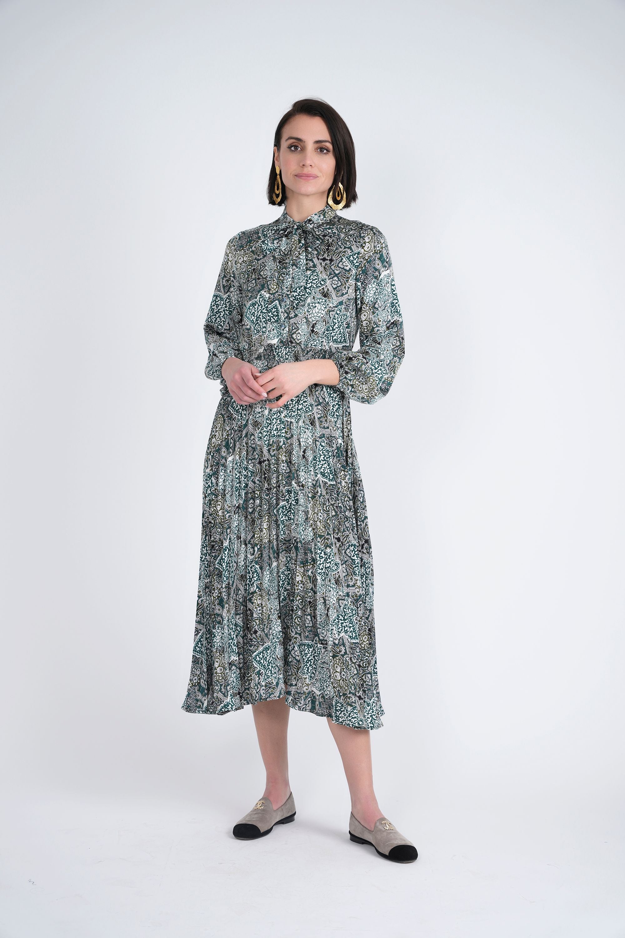 The EUX Accordion Pleated Midi Dress offers both comfort and style with its unique accordion pleat design in a vibrant green and black color combination. The tie at the neck adds a touch of sophistication to this midi dress, making it the perfect choice for any occasion. Experience sophistication and fashion with this must-have dress.