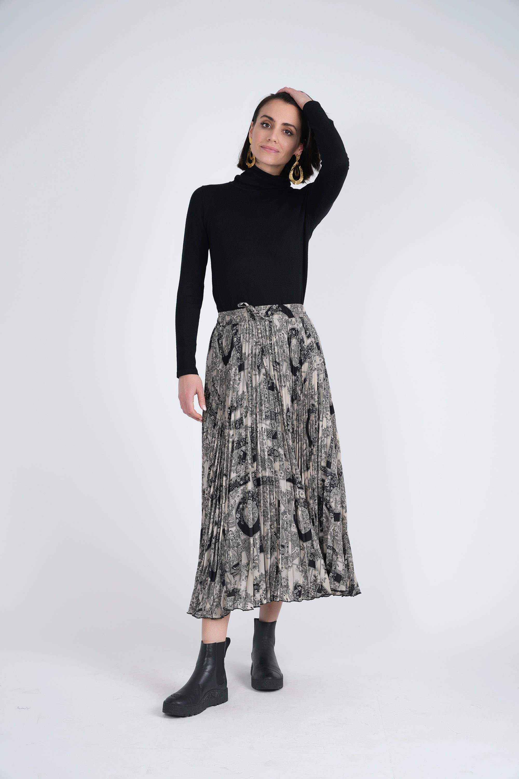 This midi skirt is made with a pleated chiffon fabric that creates elegant movement. The elastic waist is designed with a bow for a feminine touch. The small pleats add texture and sophistication to your look. Made for comfort and style.