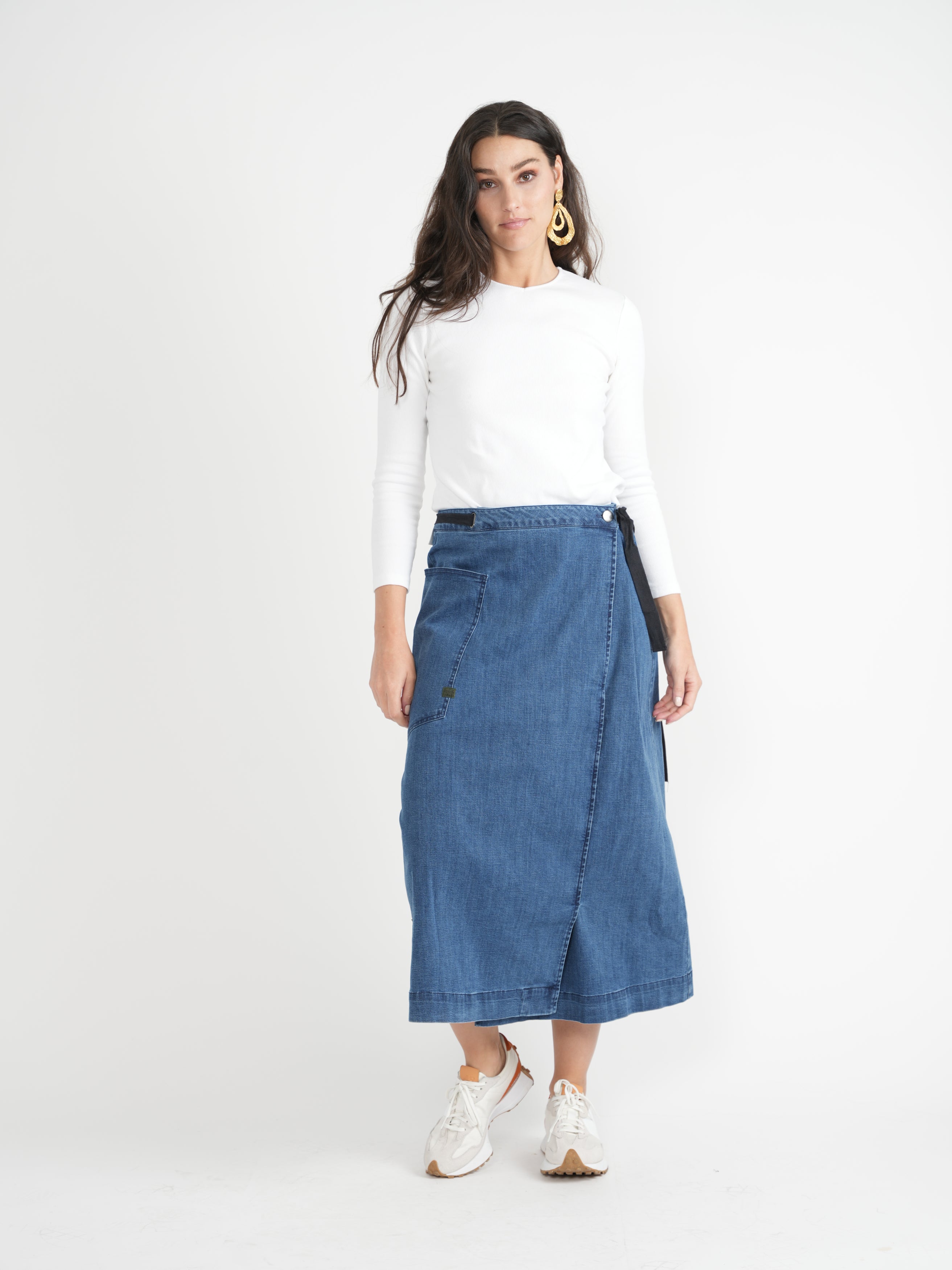 Introducing the Faves Denim Wrap Skirt! This stylish wrap skirt features a sleek black cotton tape and a convenient side pocket. Simply tie into a bow for a comfortable and chic look. Made with quality denim for a durable and fashionable addition to your wardrobe.