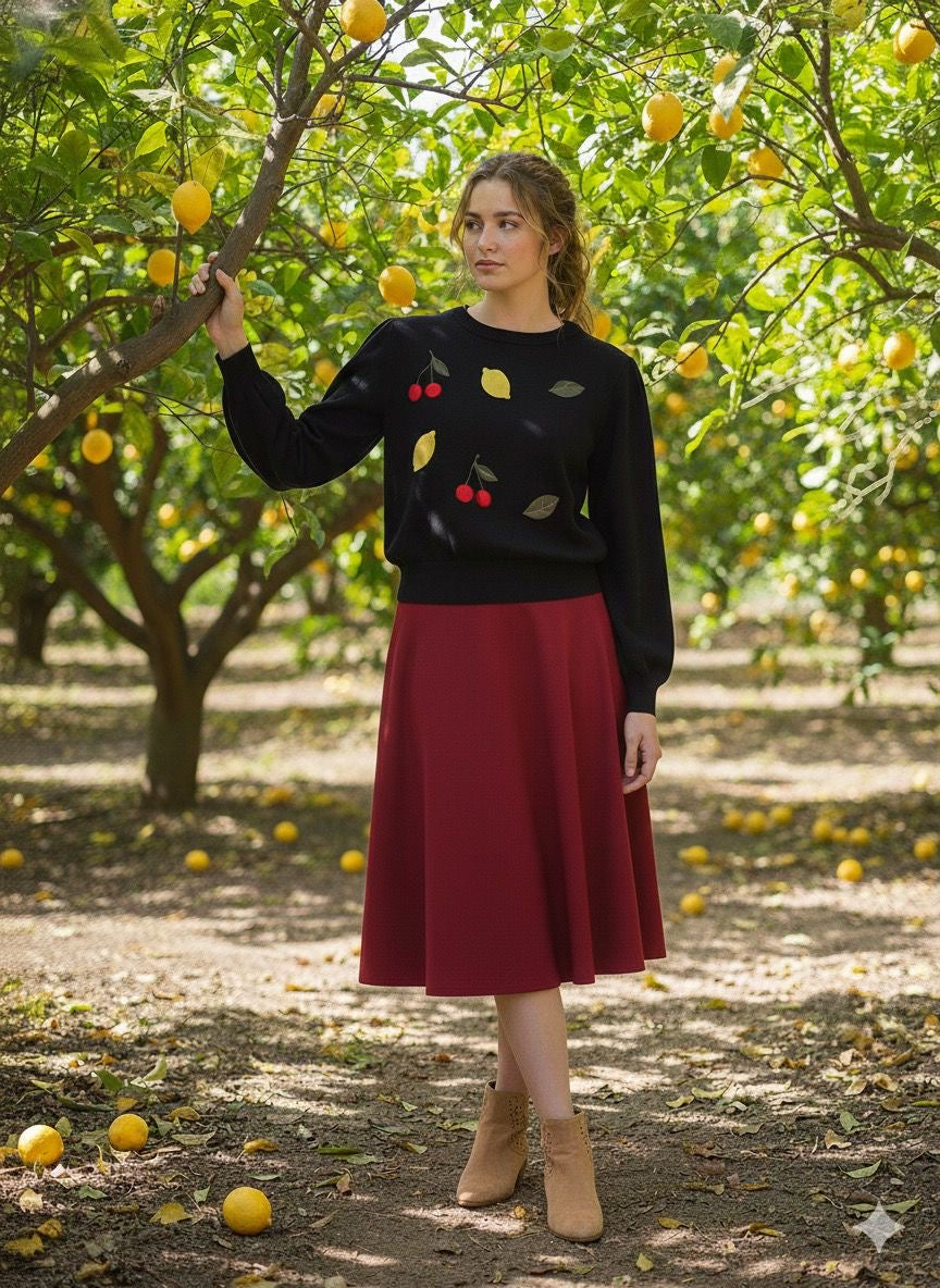Discounted products are not returnable or exchangeable A sleek black knit sweater featuring full-length sleeves and a structured ribbed waistband, accented with vibrant fruit appliqués in cherry red, lemon yellow, and leafy green. The figure-flattering fit creates a clean silhouette, making it a standout piece for both runway and everyday wear. Ideal for those seeking playful elegance with a polished, modern edge..