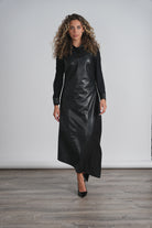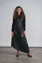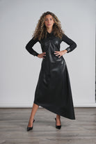 Expertly crafted from high-quality black leather, the Front Row Fahima Asymmetrical Leather Dress is a sleek and modern addition to any wardrobe. The angled hem adds a unique and stylish touch to this classic slip dress, making it perfect for any occasion. Elevate your style with this must-have dress.