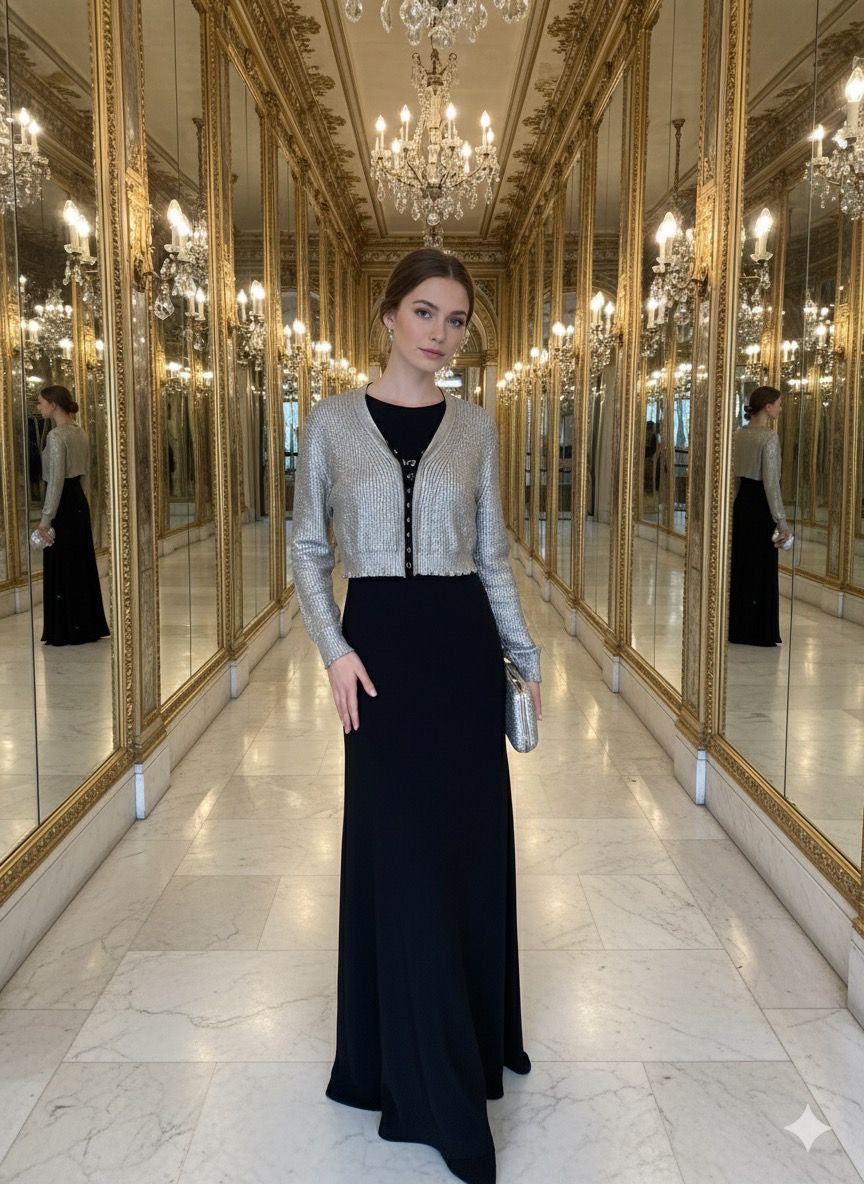 Expertly designed for the fashion-forward, the Front Row Lurex Gray Metallic Crop Sweater adds a touch of luxury to any outfit. Crafted with hidden hooks for a seamless appearance, this gray metallic crop cardigan effortlessly combines comfort and style. Elevate your wardrobe with this must-have piece.