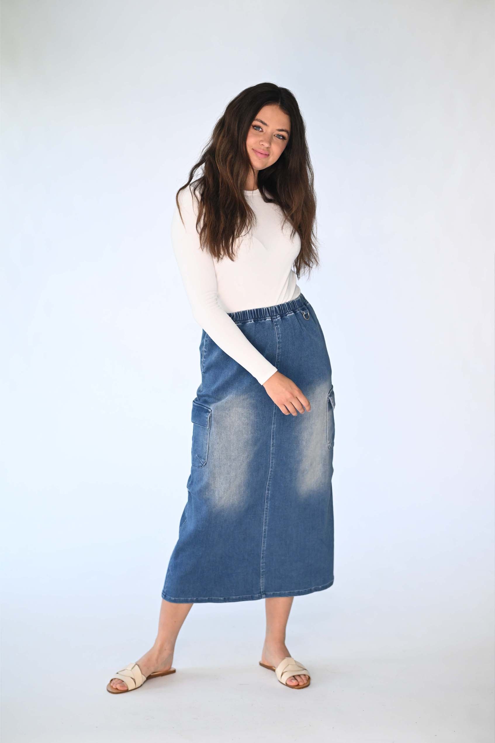Crafted with comfort and style in mind, the Latitude Cargo Denim Skirt features a washed denim look and an elastic waist for the perfect fit. Its large side pockets provide ample storage, making it the ideal choice for a casual yet functional look. Elevate your wardrobe with this versatile piece.