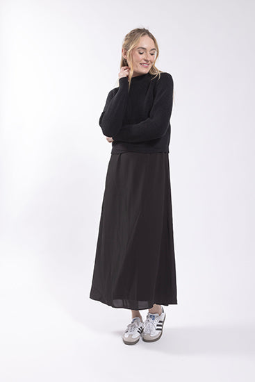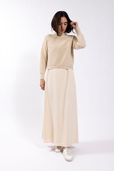 Stay stylish and warm with our Latitude Crossover Hem Sweater. This cream and black knit sweater features a chic crossover hem and a comfortable moc collar. Make a statement with this trendy and versatile piece.