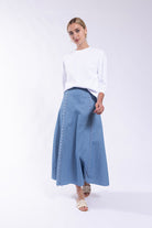 The Latitude Double Light Blue Lace Up Skirt features an A-line silhouette crafted from durable denim, providing both comfort and style. The side zipper ensures a secure fit, while the lace-up design adds a unique visual element, appealing to modern fashion sensibilities. Please note, discounted items are final sale and not eligible for return .