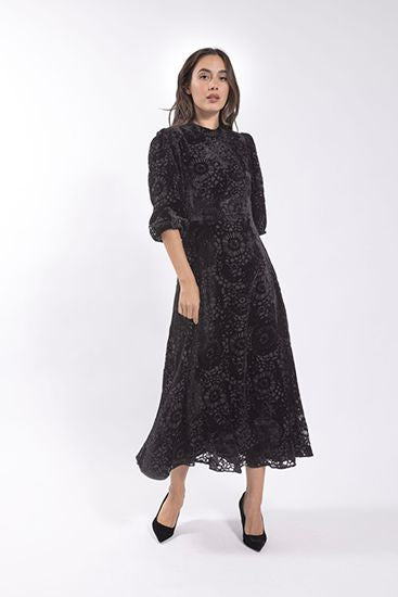 Expertly crafted with soft velvet and delicate lace, the Maple Cliff dress flatters with a tailored waist and flared bottom. The 3-quarter sleeves add a touch of sophistication. Elevate your look with this timeless piece that exudes elegance and femininity.