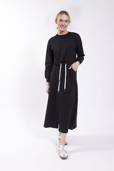 Experience ultimate style, comfort, and versatility with the Monn Cropped Boxy Sweatshirt. In black and denim. Designed to elevate your wardrobe, this sweatshirt features a cropped and boxy silhouette that effortlessly pairs with the coordinating skirt (sold separately) for a chic and coordinated look. Perfect for any casual or dressy occasion, add this essential piece to your fashion collection.