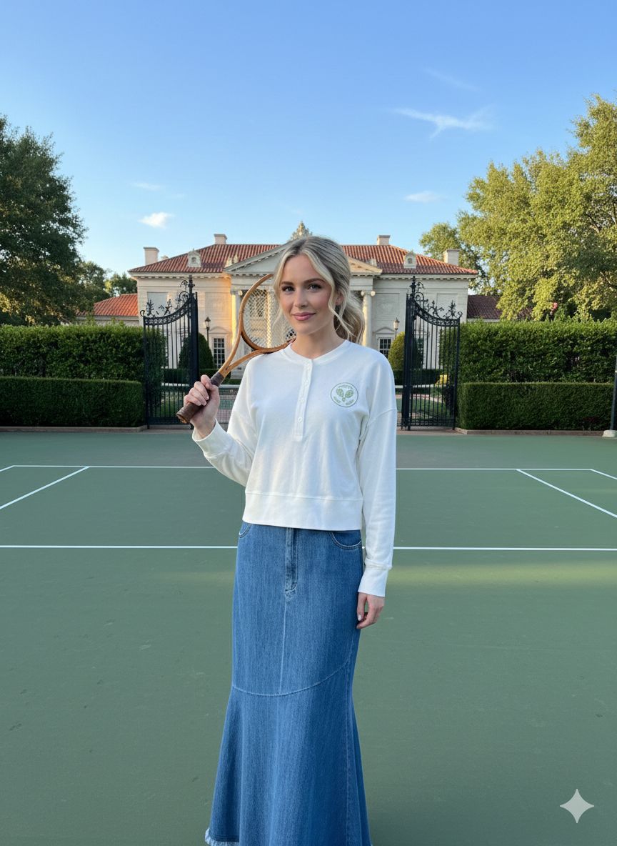 The Monn Cropped Tennis Logo Henley features a stylish ivory color and a practical four-button front closure. Designed with a tennis graphic on the left sleeve, this cropped top combines functionality with a sporty aesthetic, suitable for both athletic and casual wear. Please note that discounted items are final sale.