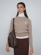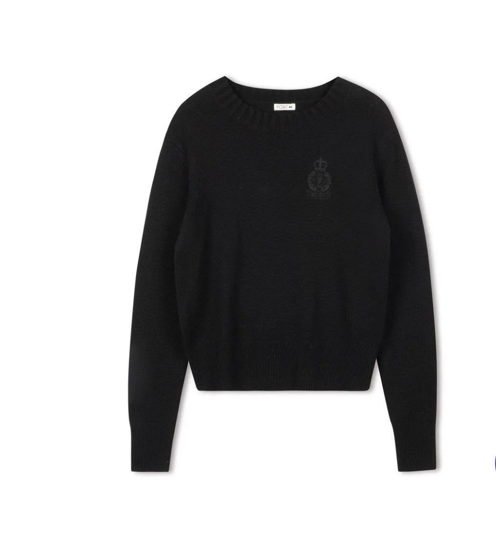 This Point Fine Knit Crew Top is the perfect addition to any wardrobe. Crafted with a brown heather and black knit, it features a crest design that adds a touch of sophistication. Comfortable and stylish, this top is perfect for any occasion.Discounted products are not returnable or exchangeable