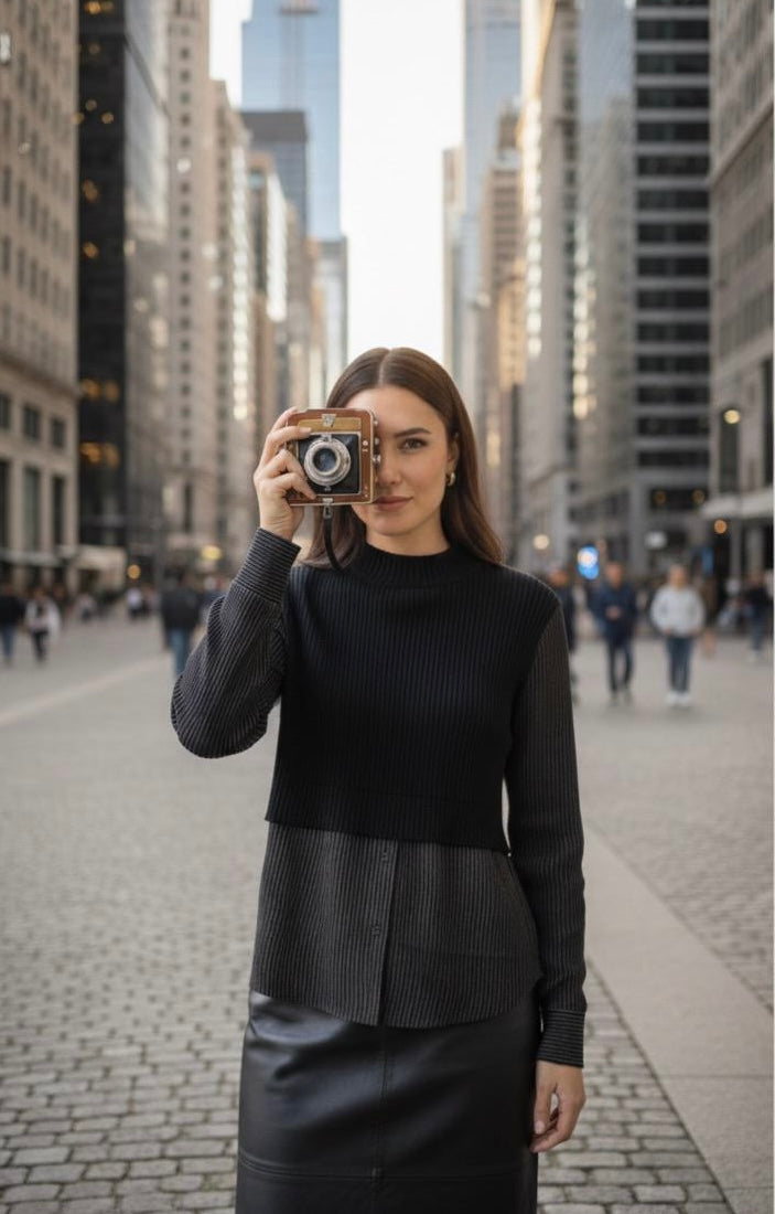 This Point Twofer Sweater features a sophisticated black pinstripe blouse with an attached mock neck turtleneck. This modern two-in-one design offers a sleek and professional look for any occasion. With its versatile and timeless style, this sweater is sure to become a staple in your wardrobe. Discounted products are not returnable or exchangeable
