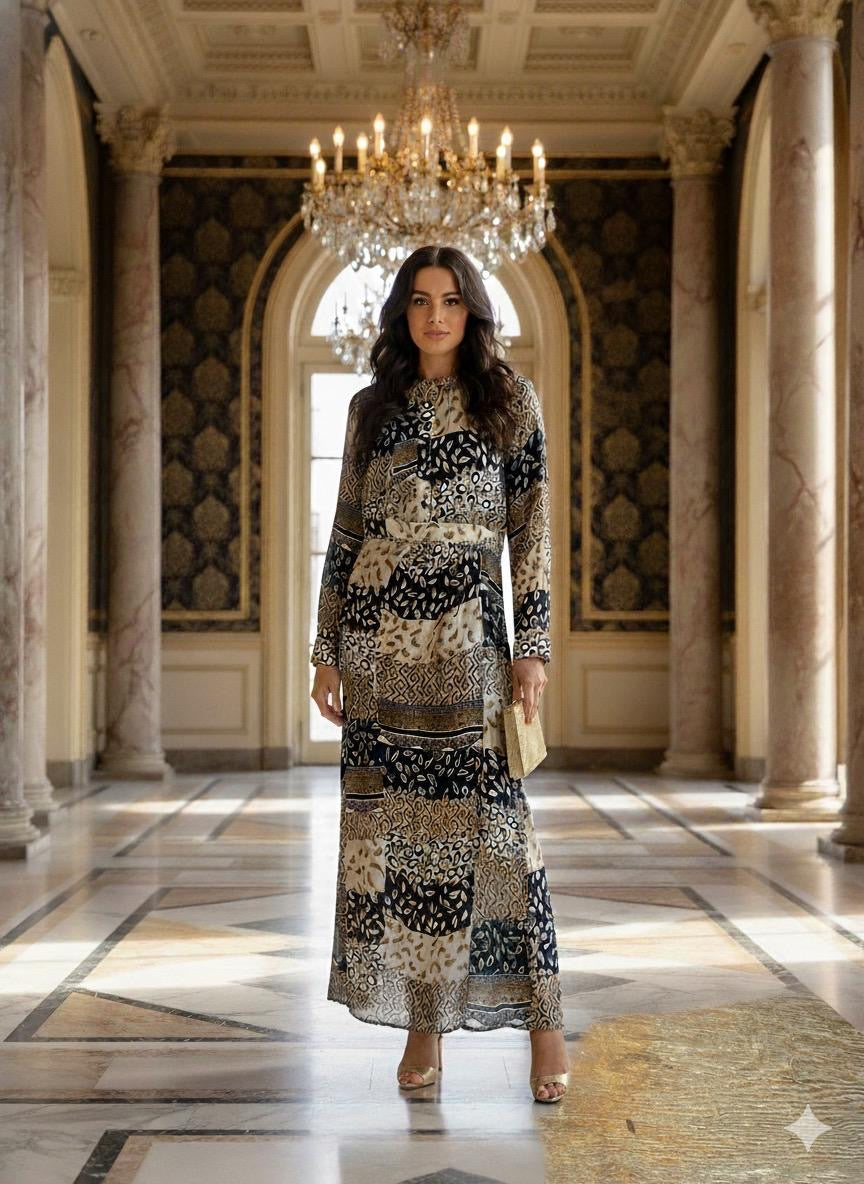This Maple Cliff dress features a versatile multi-print design and elegant drape, making it a perfect addition to any wardrobe. With long sleeves for added coverage, this dress offers both style and functionality. Elevate your fashion game with this must-have piece. Discounted products are not returnable or exchangeable