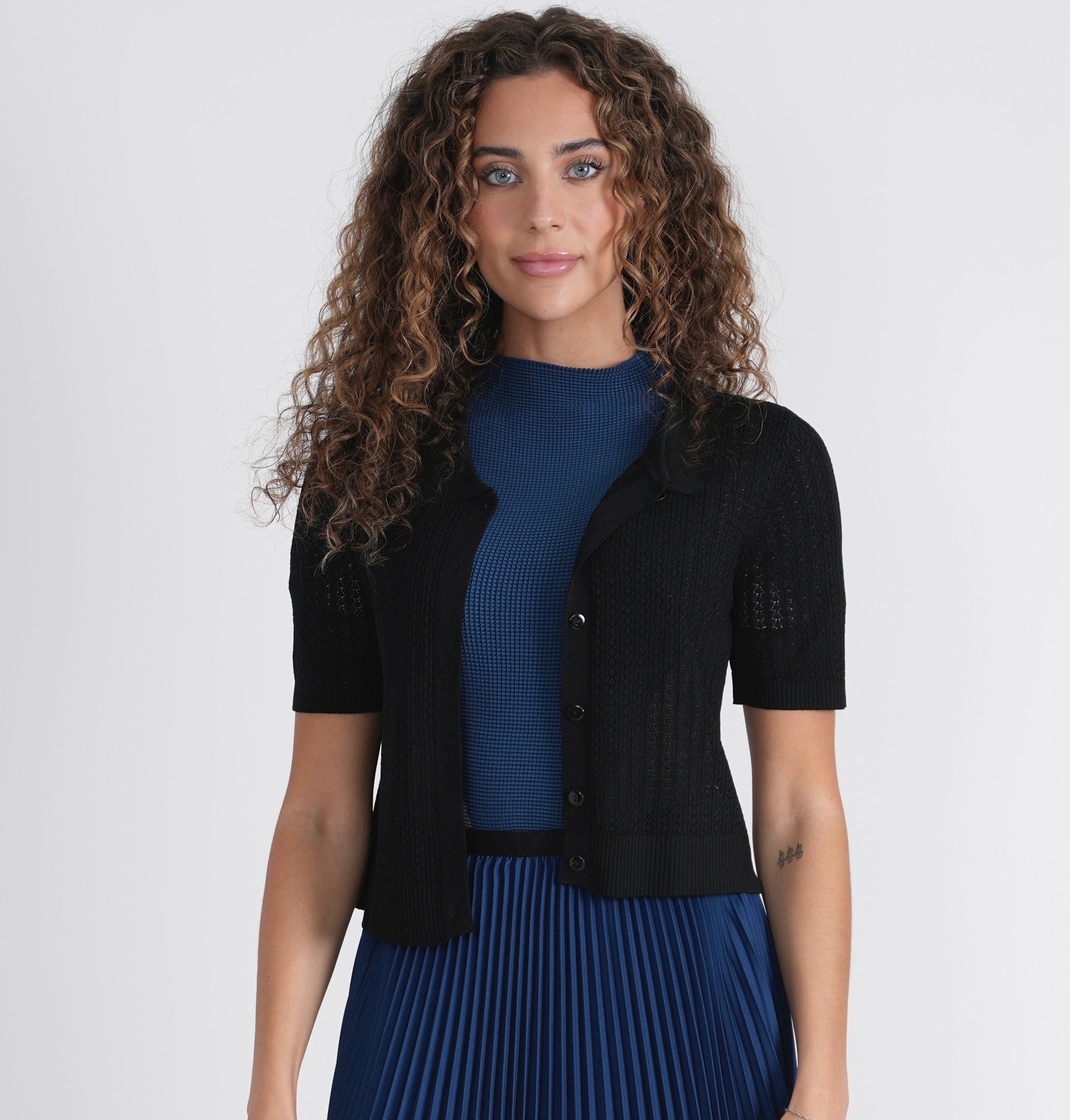 Expertly crafted from high-quality materials, this Front Row Crop Knit Cardigan is a must-have addition to any wardrobe. With long sleeves and a knit design, this cropped cardigan is both stylish and comfortable. Perfect for layering or as a statement piece, it adds a touch of sophistication to any outfit.
