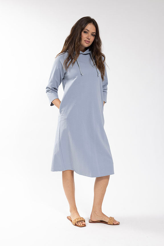 Elevate your casual style with our Latitude 3/4 Sleeve Hoodie Dress. The dusty blue color adds a touch of sophistication to the comfortable, drawstring design. Perfect for cooler weather, this dress features 3/4 sleeves for added coverage while still showing off your fashion sense.Discounted products are not returnable or exchangeable