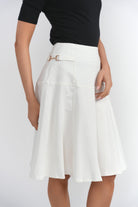 Clean and structured, this white denim skirt is designed with a flattering silhouette and elevated details. Finished with statement gold buckles at each side and a sleek center back zipper, it’s a polished take on everyday denim.