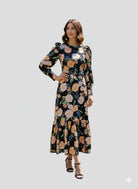 The Anastasia Maxi Dress is an elegant and beautiful piece with a soft, buttery feel. It comes with a belt and features puffed shoulders, while the bottom showcases a tiered design with a floral pattern, making it perfect for summer.Discounted products are not returnable or exchangeable