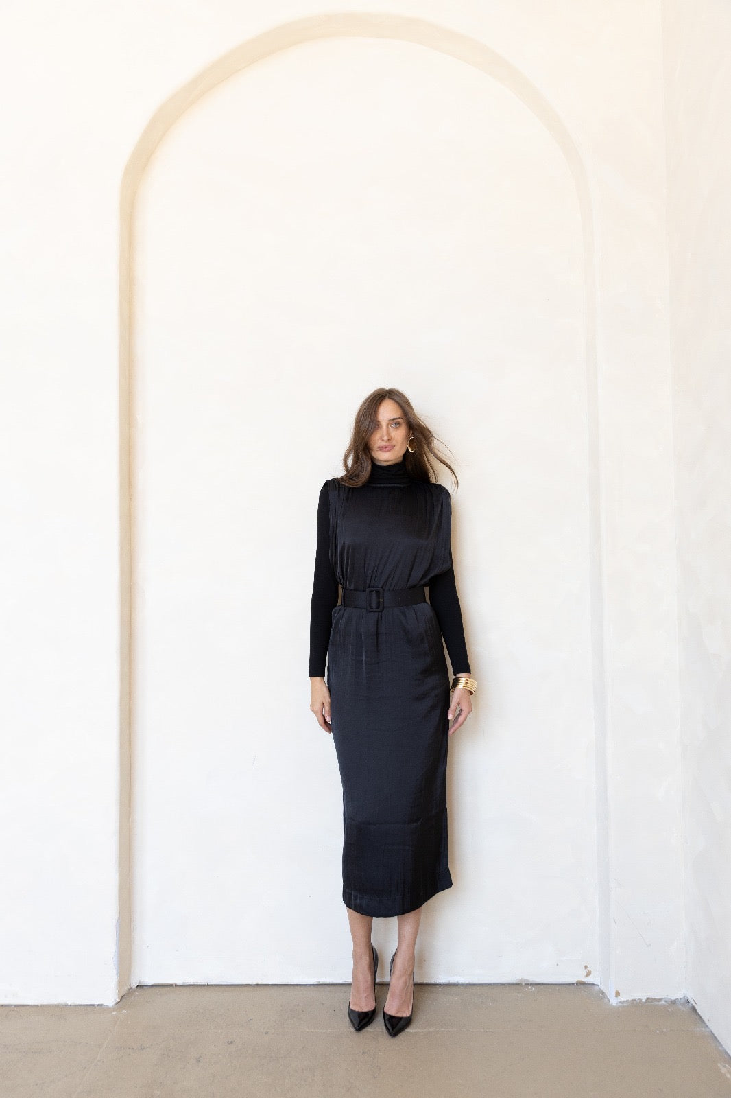The Serena Dress is a chic two-piece ensemble that includes a stylish shirt and a silky jumper, both complemented by a coordinating belt. Ideal for dressing up for dinner or any special occasion, this set offers elegance and versatility. It is available in three distinct colors: black, navy, and taupe, allowing you to choose the perfect hue for your look.
