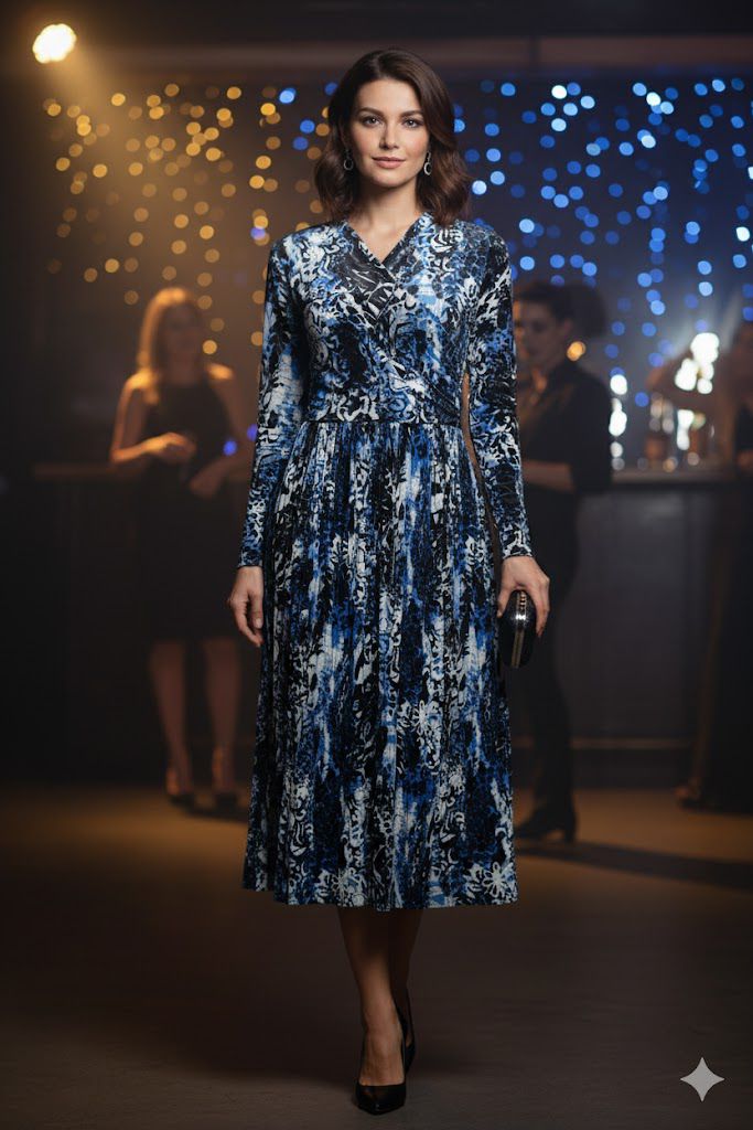 Elevate your style with our Rouge Pur Couture Maxi Dress. Its pleated skirt and wrap neck add a touch of elegance, while its long sleeves provide comfort. Available in black/blue or black/mint print, this dress is perfect for any occasion. Add a touch of sophistication to your wardrobe.Discounted products are not returnable or exchangeable