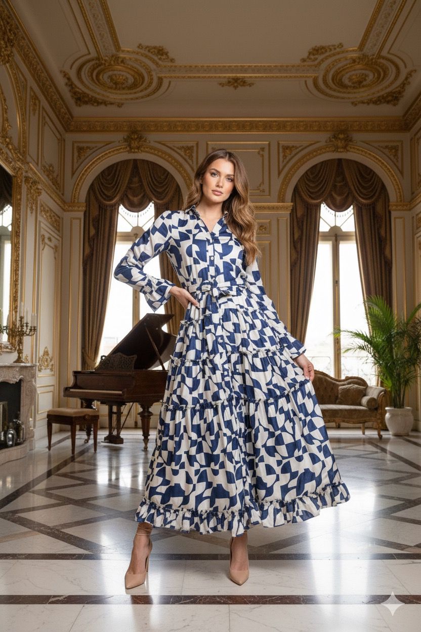 This navy and cream geo print tiered dress offers a perfect blend of style and comfort. With its unique design and flattering fit, it is perfect for any occasion. Made with high-quality fabric, it is both durable and fashionable. Elevate your wardrobe with this must-have dress.Discounted products are not returnable or exchangeable