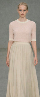 The short sleeves make it perfect for year-round styling, while the ribbed neckline, cuffs, and waistband create a flattering, polished silhouette. Lightweight and comfortable, it pairs effortlessly with skirts, trousers, or denim for a chic, understated finish.