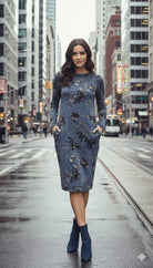 Introducing the Japparel Alice Denim Floral Dress with Pockets. This stylish dress features a gorgeous blue floral knit print and two convenient pockets. Stay comfortable and fashionable while on the go.Discounted products are not returnable or exchangeable