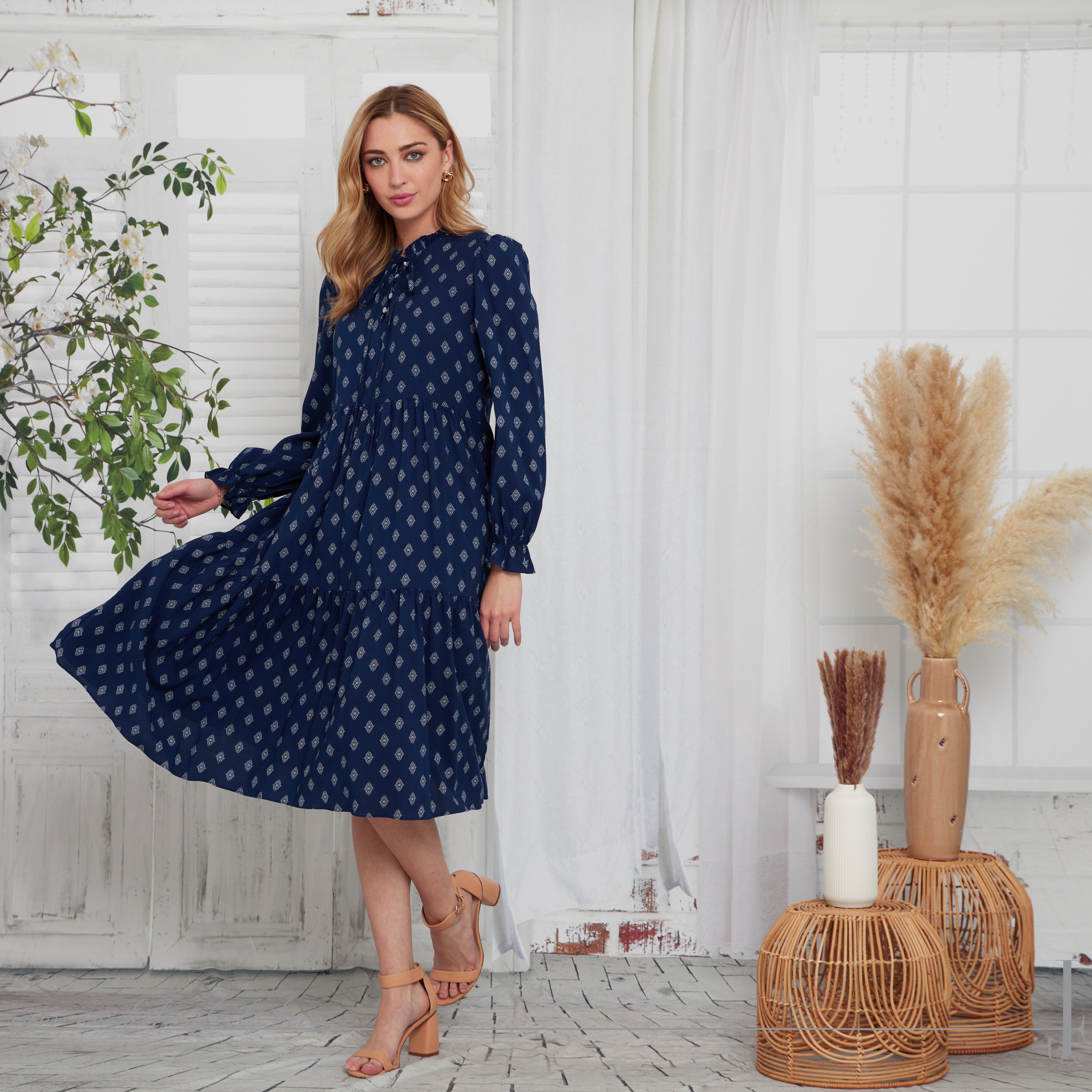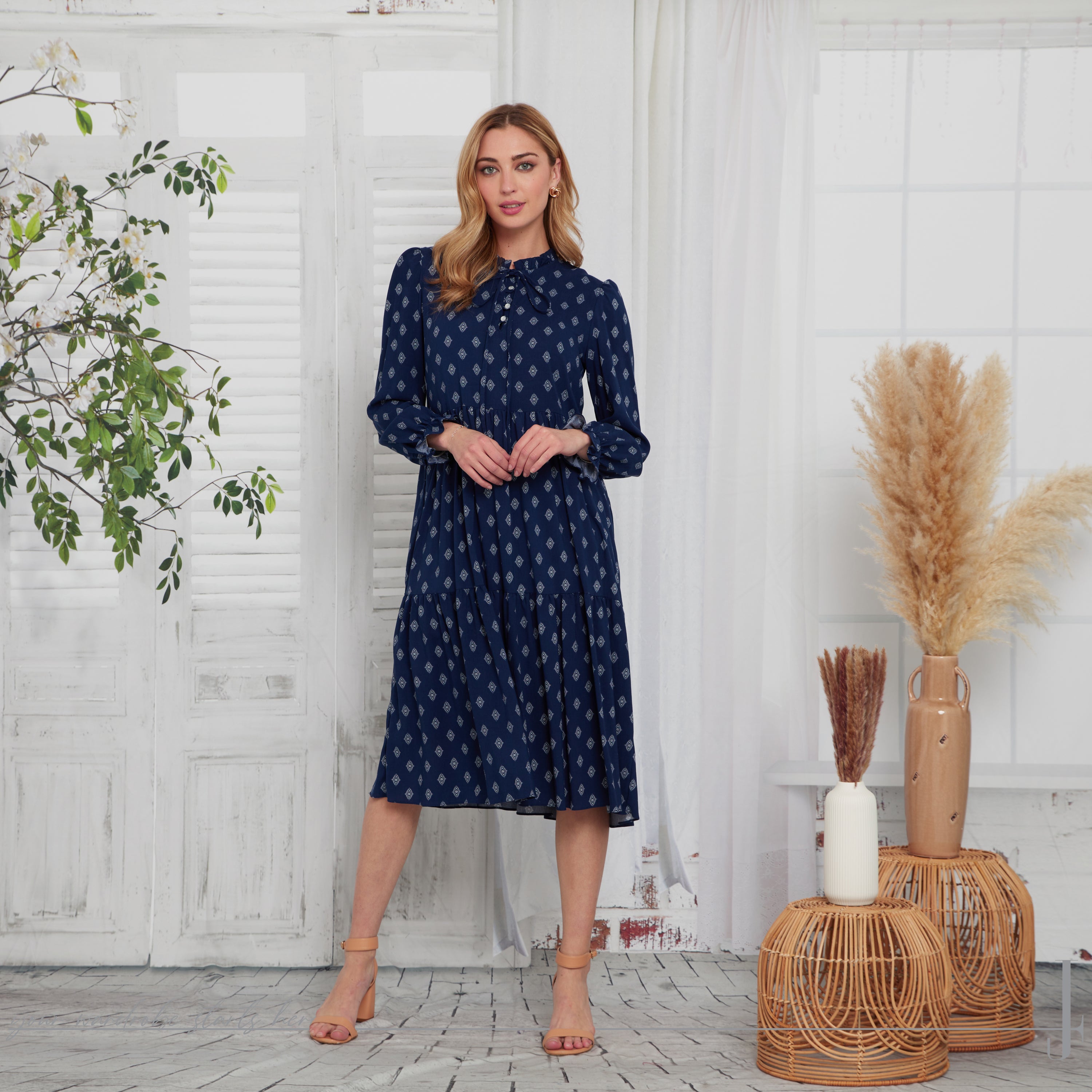Expertly designed for a stylish touch, the Japparel Debra Tiered Crepe Bandana Print Dress adds a unique flair to your wardrobe. With its navy tie at the neck and buttons, this dress offers a perfect fit and effortless elegance. Made with high-quality crepe fabric, it is both comfortable and fashionable.Tiered crepe dress with shank buttons tie at ruffled neckline