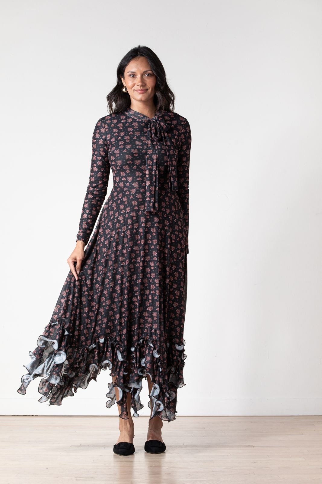 A new take on our beloved Europa dress, this piece is for those who already love it — or those who wanted something just a little different. Made from the same signature stretch mesh, it features a clean, fitted bodice with a feminine tie detail and a flowing A-line skirt with a ruffled handkerchief style hem for added movement and charm.