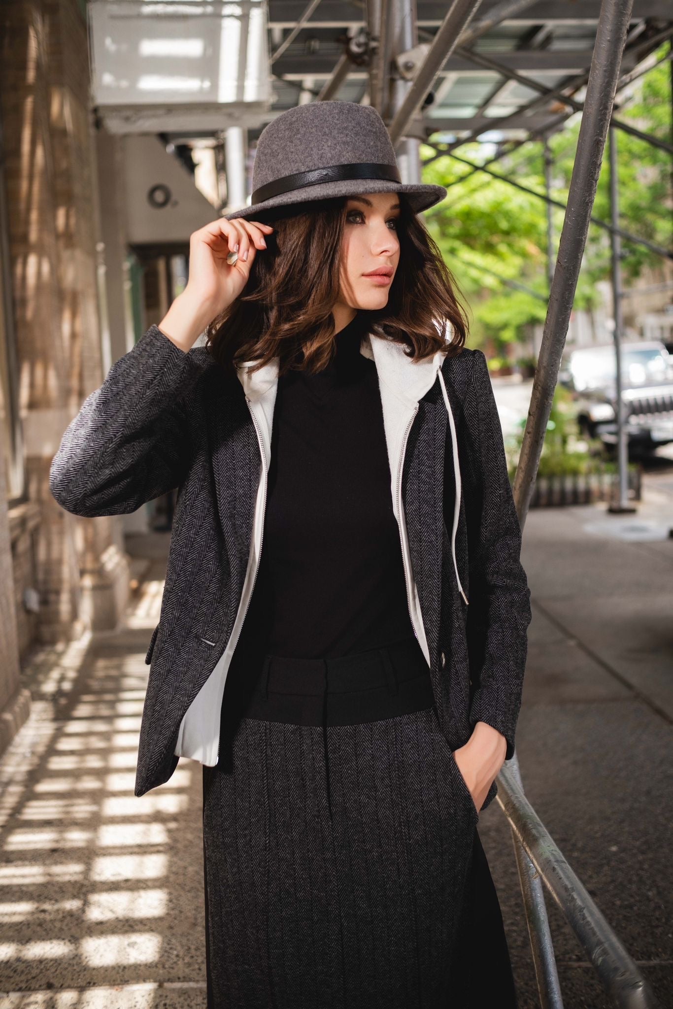 The Luum Brooke Blazer boasts a stylish herringbone design with a detachable white hoodie, adding versatility to your wardrobe. With two front flap pockets and available in black or ivory, this blazer exudes sophistication. Complete the look with the coordinating skirt, sold separately.
