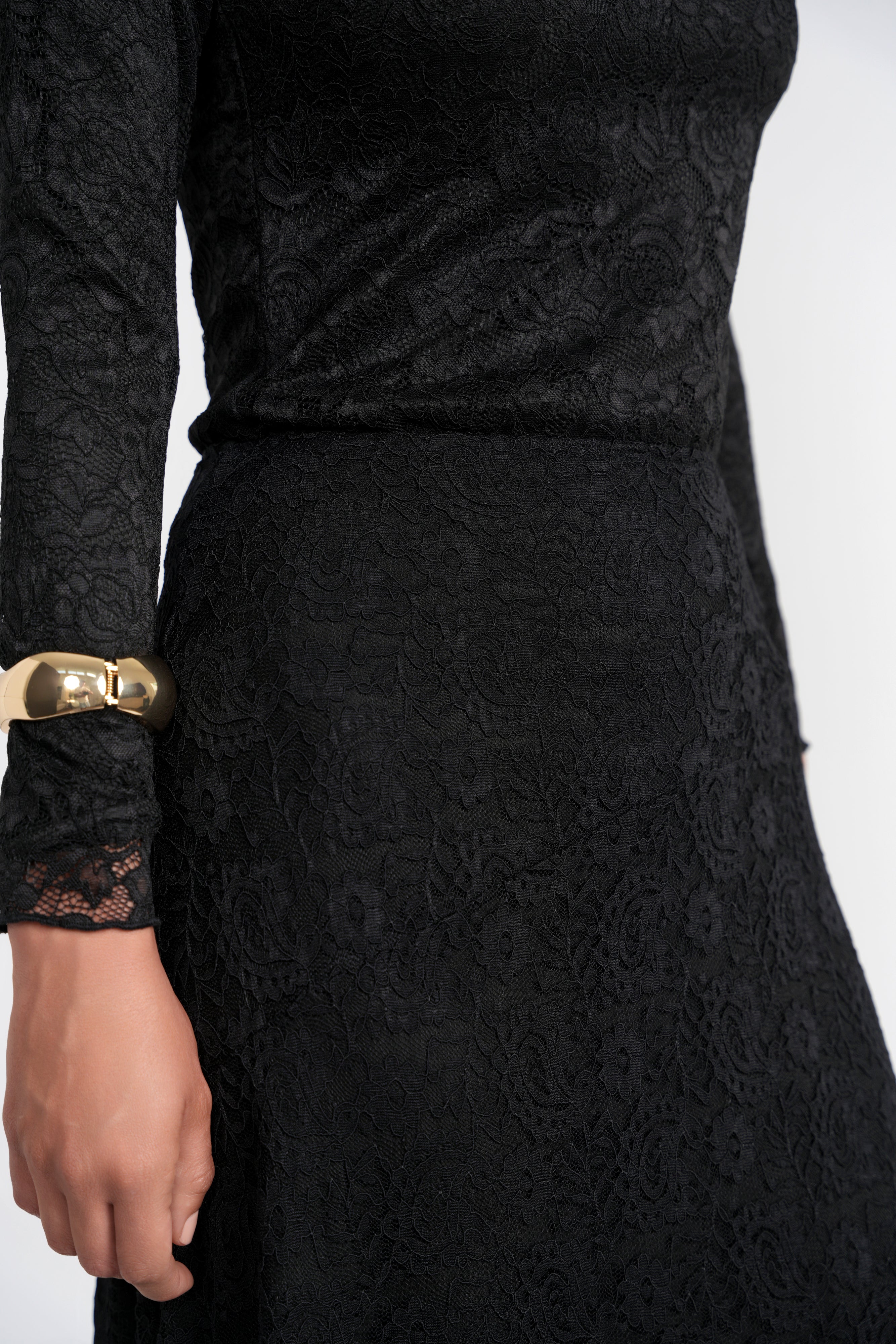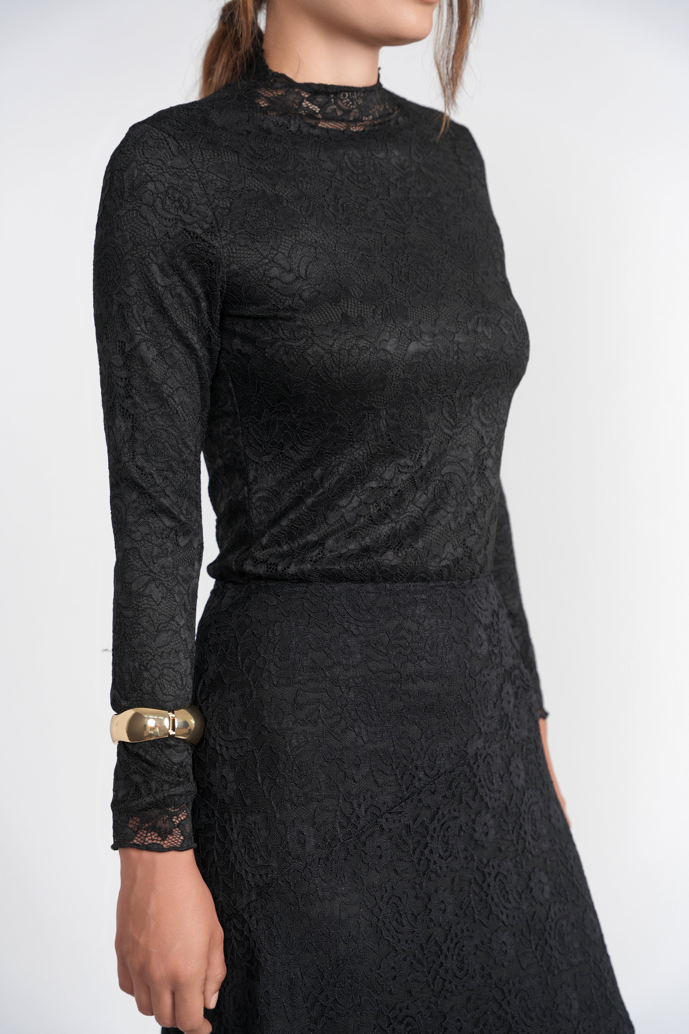 - The Elle Top is a fitted mock-neck crafted from delicate lace that mirrors the skirt's intricate texture.