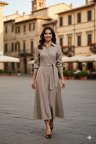 - Featuring a crisp collar and a full button-down front, it's cinched at the waist with a self-fabric tie belt, creating soft structure and a flattering, elongated shape. The tailored details and fluid lines strike a balance between ease and sophistication.