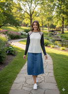 Introducing the Monn Colorblock Envelope Neck Top. This trendy t-shirt features an envelope neck design and colorblock pattern. The grey sleeves and camel back and shoulders pair perfectly with the cream front, while the blue sleeves and blue back and shoulders complement the cream front. Express your style with this versatile top.Discounted products are not returnable or exchangeable