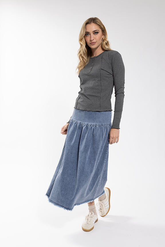 Upgrade your basic Henley with our Monn Outside Seam Henley. Featuring unique outside seams on the front for added style and durability. Available in lilac, charcoal, and black, this top is perfect for any occasion. Elevate your wardrobe today!