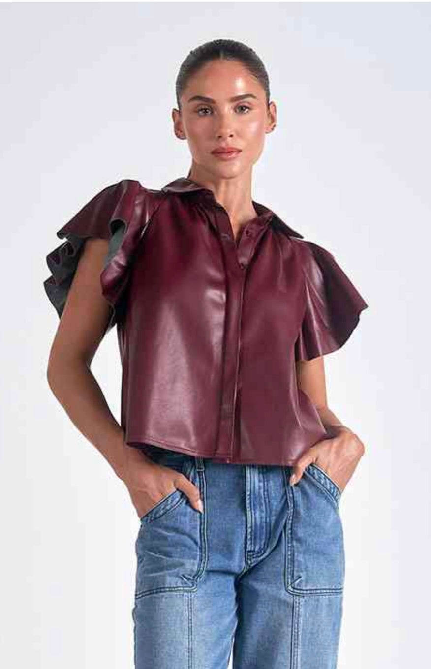 Elan Burgandy Vegan Leather Cap Sleeve Top