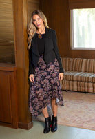 This Adina Kerchief Hem Fall Foliage Skirt features a unique kerchief hem design in a beautiful fall foliage pattern. The black multi-color adds a touch of versatility to this statement piece. Perfect for adding a touch of sophistication to any fall wardrobe.Discounted products are not returnable or exchangeable