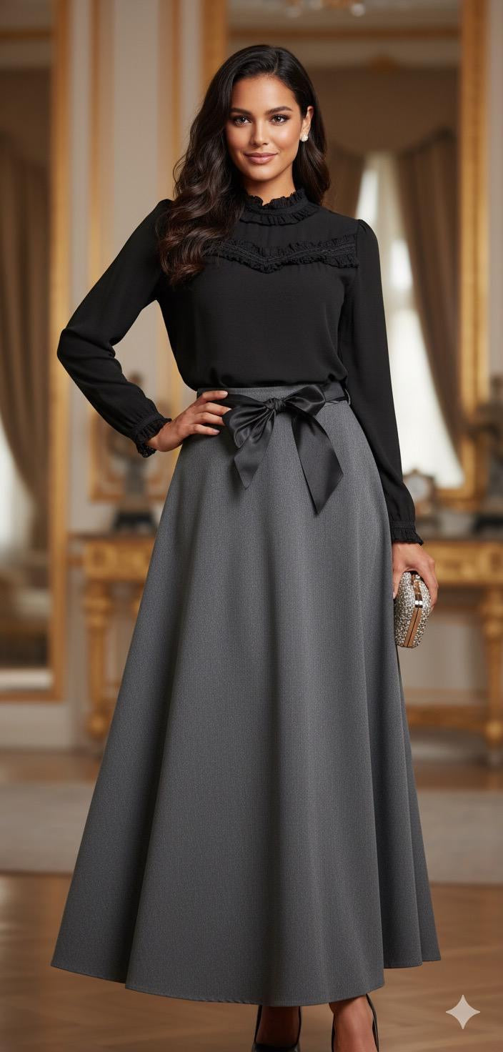 Featuring a classic A-line design, this skirt is crafted with a stylish charcoal grey fabric and includes a black silk ribbon for a chic bow detail. Perfect for adding a touch of sophistication to any outfit.Discounted products are not returnable or exchangeable