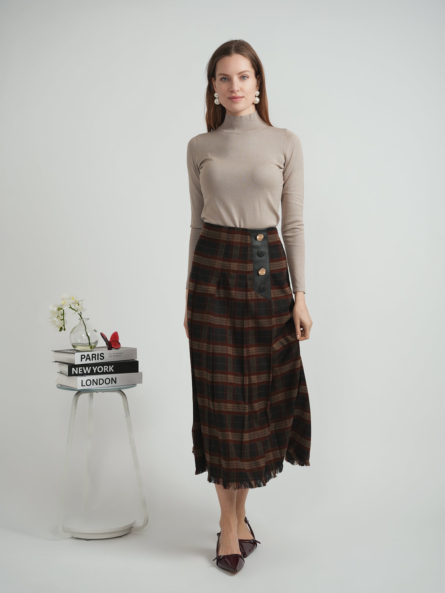 Upgrade your wardrobe with the B Chic Pleated Plaid Skirt. This stylish skirt features a classic plaid pattern, accented with a fringe bottom for added flair. The four side buttons, two gold and two navy, add a touch of sophistication. Perfect for making a statement while maintaining a professional and polished look. Discounted products are not returnable or exchangeable