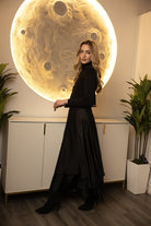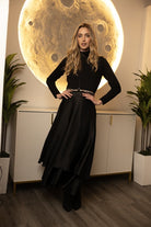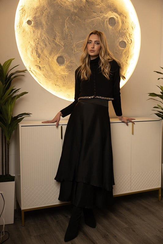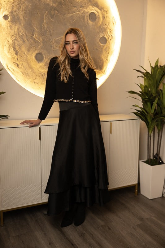 Expertly crafted, the Byrd Ira Satin Skirt is a must-have addition to any wardrobe. This black satin skirt boasts a wide waistband and two layers for a sophisticated and versatile look. Elevate your style with comfort and elegance with this essential piece.P