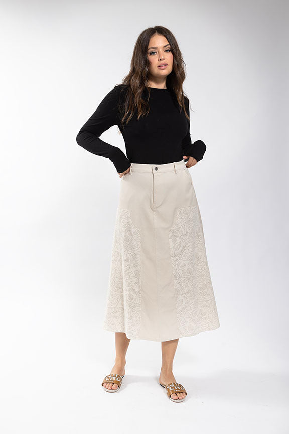 The Concept Floral Print Combo Denim Skirt is a chic addition to any wardrobe. With its denim fabric and floral print detail on the sides, this A-line skirt exudes both style and comfort. Available in ivory and black, it's the perfect piece for any occasion. Elevate your wardrobe and make a statement with this versatile skirt. Discounted products are not returnable or exchangeable