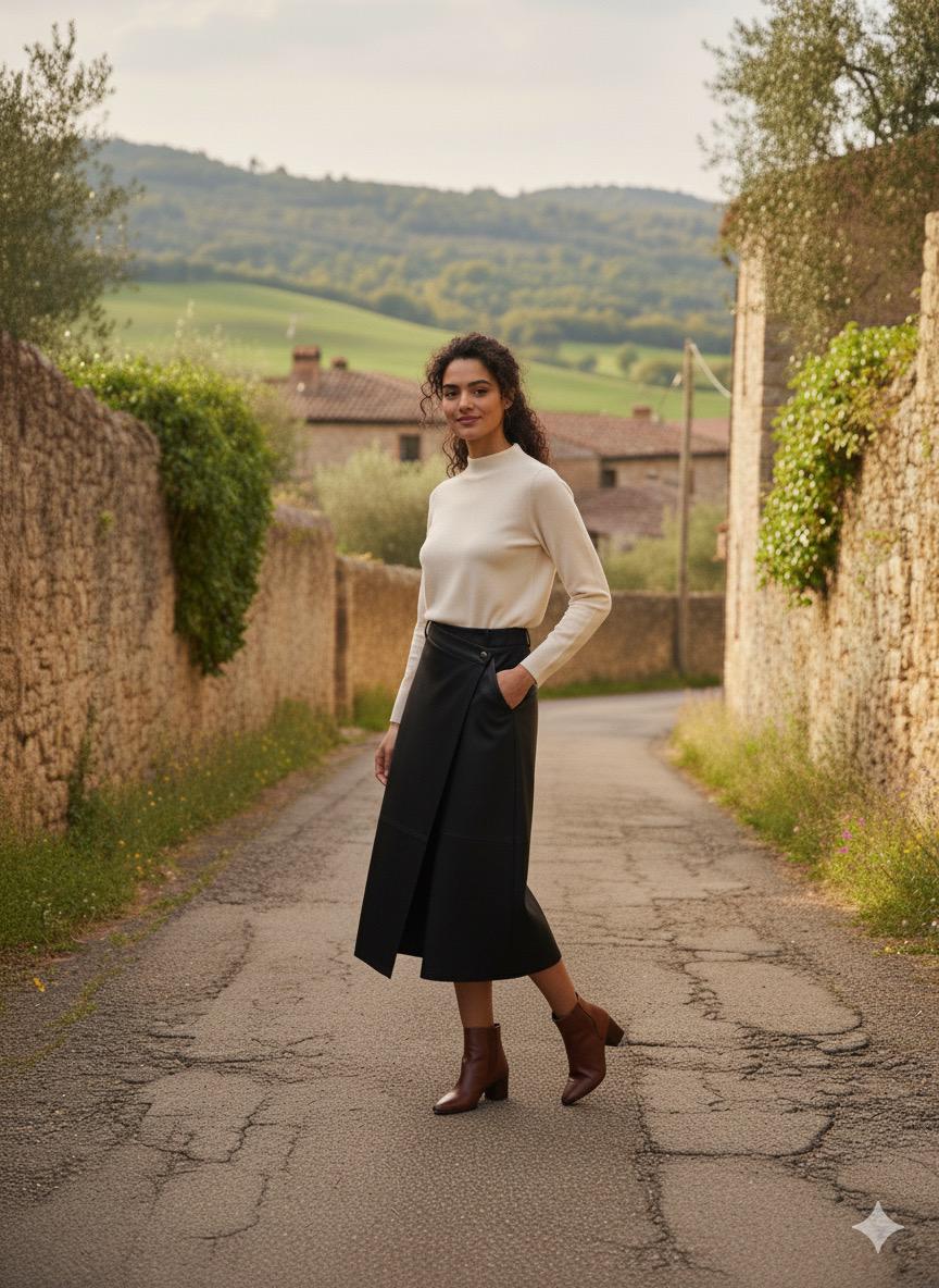 Crafted from premium black leather, this Faves Wrap Midi Skirt is the perfect addition to any wardrobe. The versatile design allows for easy transitioning from day to night, while the wrap style flatters all body types. Elevate your style with this classic and timeless piece.Discounted products are not returnable or exchangeable
