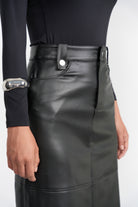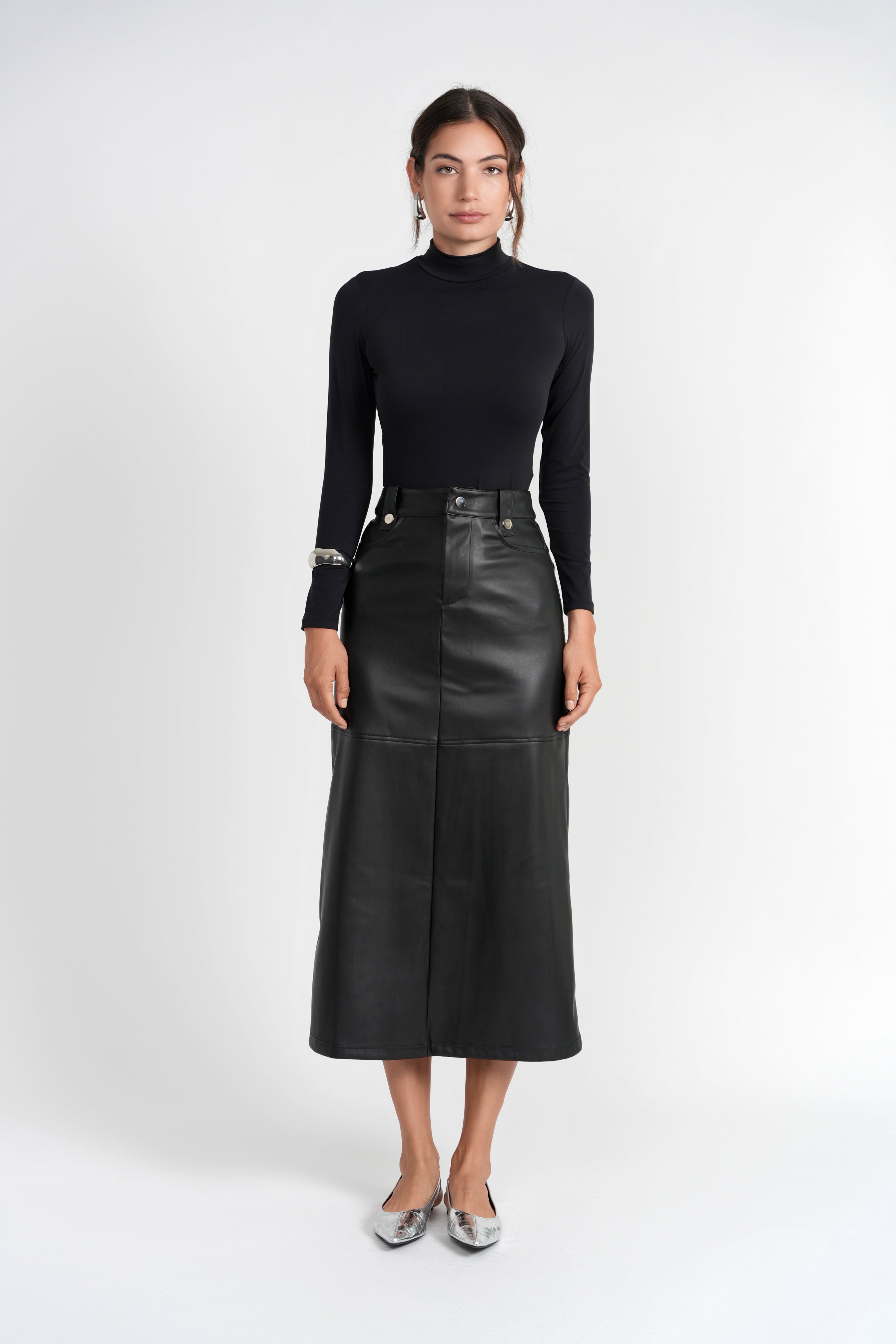 • The Tanya Skirt is a modern A-line silhouette, expertly crafted in supple vegan leather with a clean, structured finish.