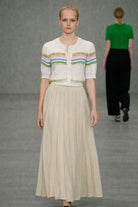 Bring freshness and charm to your wardrobe with this beautifully crafted textured knit cardigan. Designed in a crisp ivory base, it features soft pastel stripes woven across the chest and sleeves—creating a look that is both playful and elevated.