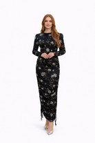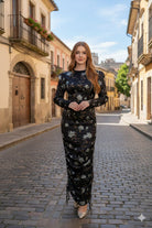 Stay stylish and comfortable with the Nina Black Floral Drawstring Dress. This dress features a delicate black floral pattern and a ruffle detail on the cuff of the sleeves. The drawstring on the bottom allows for a flattering and customizable fit. Look effortlessly chic in this must-have dress.>discounted products are not returnable or exchangeable