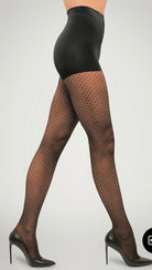 • Medium forming opaque panty part (waist, hips, bottom) with sheer legs featuring a geometric rhomb design with dots