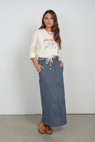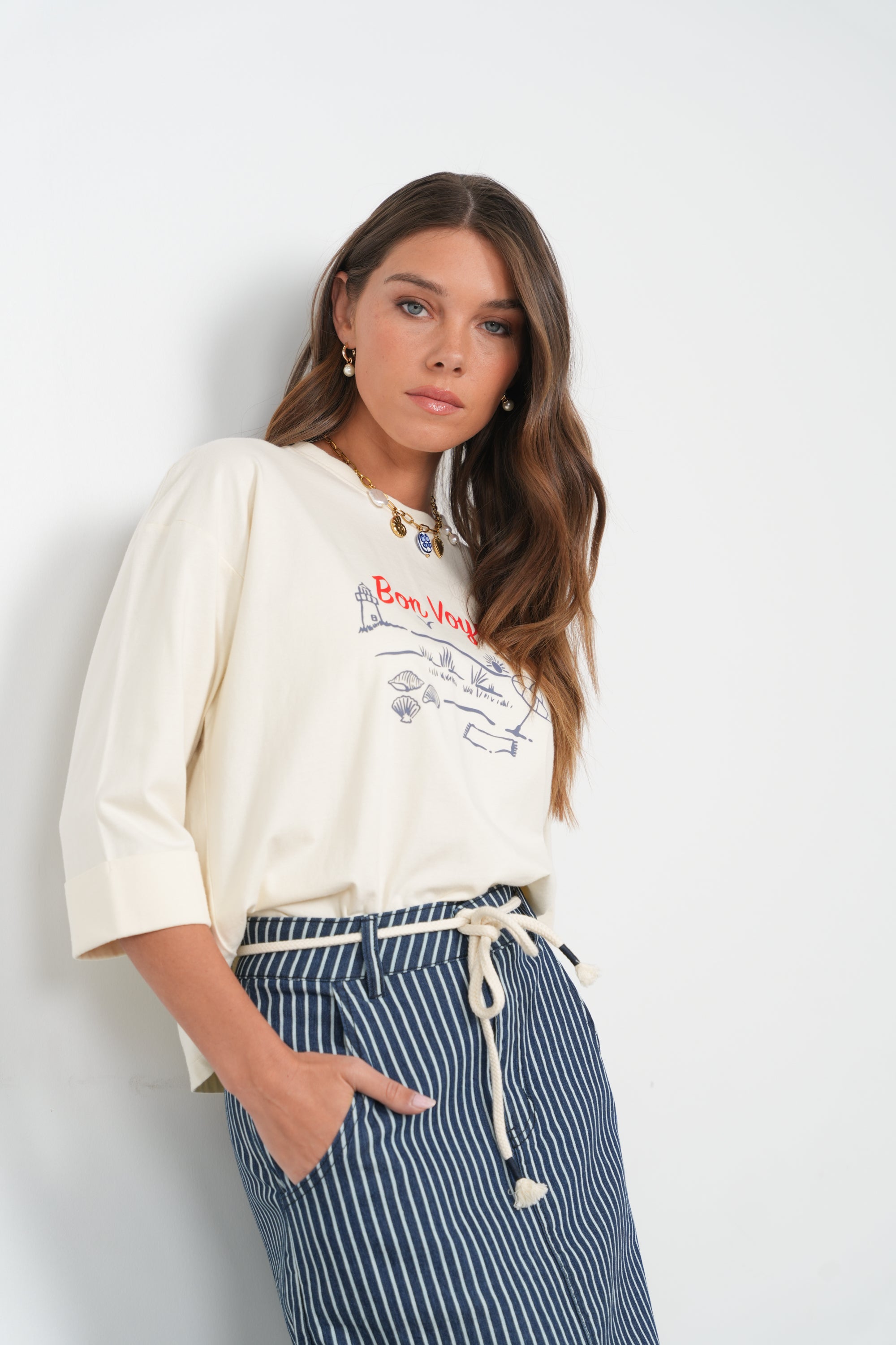 The Point Graphic Cream Bon Voyage Roll Cuff Tee features a cream fabric with a striking red "Bon Voyage" print on the front. Its 3/4 sleeves with cuffs provide a fashionable yet comfortable fit, making it suitable for various casual occasions. This tee combines style with functionality, offering versatility in wardrobe choices.Discounted products are not returnable or exchangeable